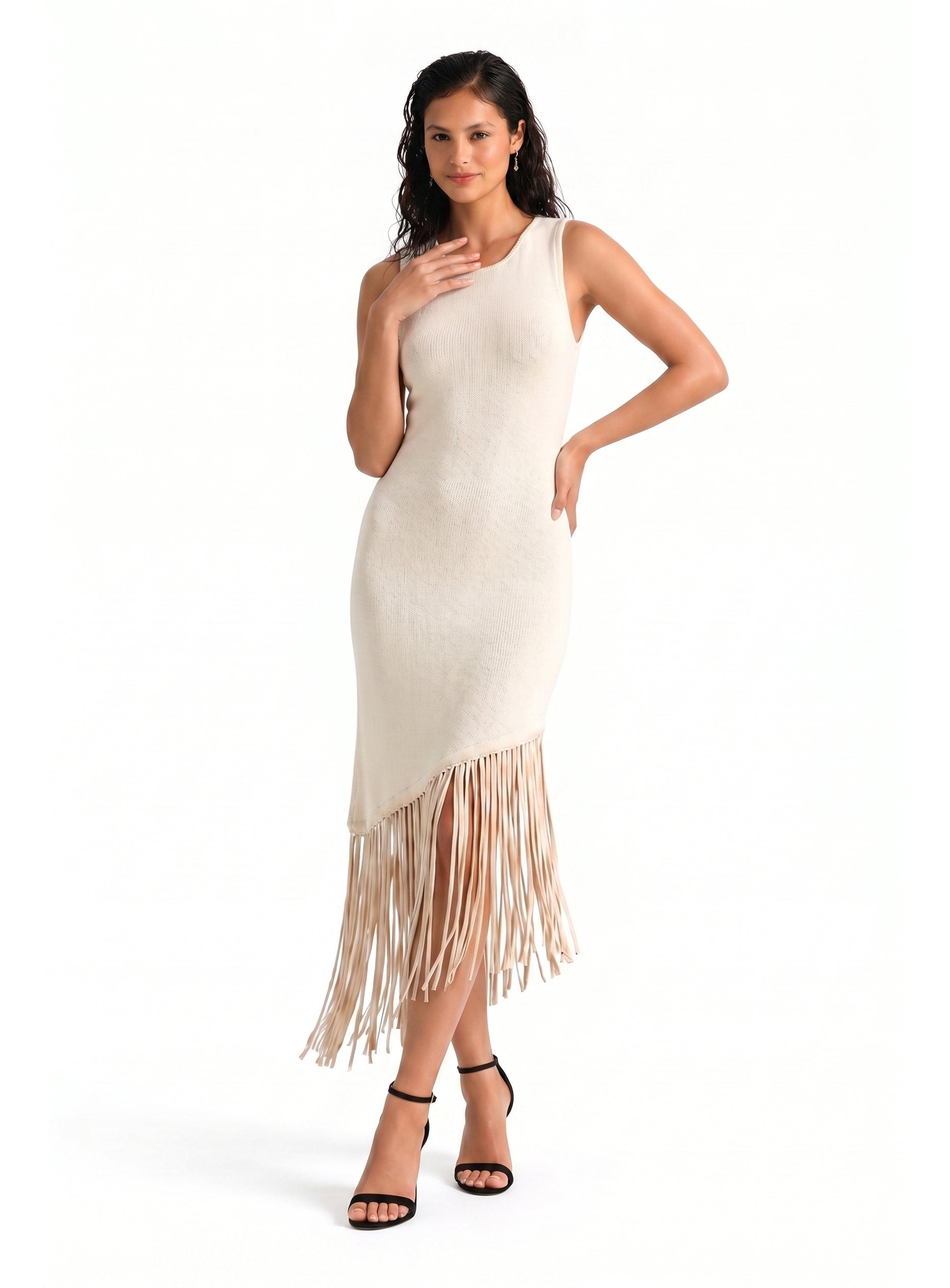 Boucle Knit Sleeveless Asymmetrical Fringe Dress
