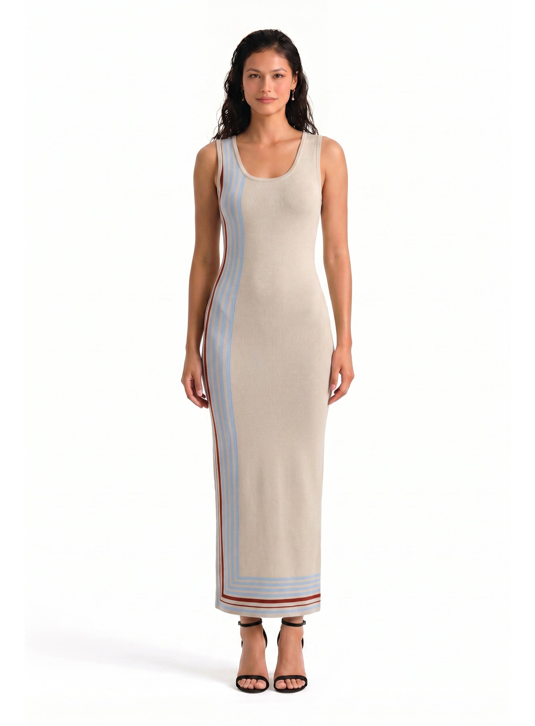 Knit Button Embellished Stripe Maxi Sleeveless Dress